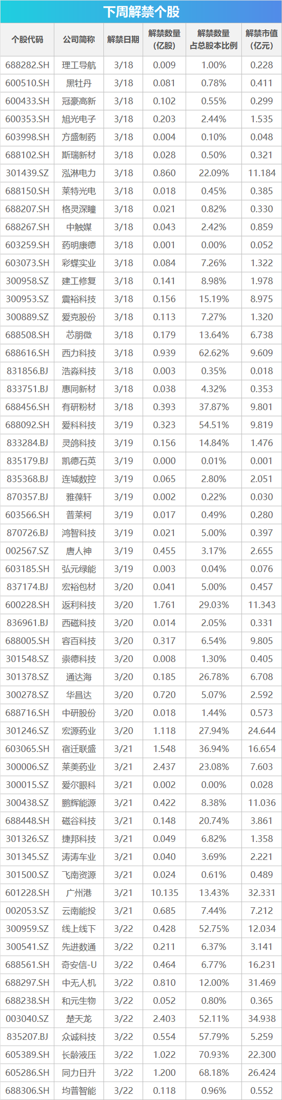 转融券“T+1”3月18日起正式实施;多个重磅级大会下周举行;下周迎来“超级央行周”;下周将有58只股解禁;下周将有2只新股发行。