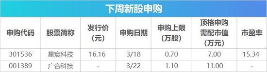 Wind数据显示,下周(3月18日-3月22日)将有2只新股发行,其中深市主板有1只,创业板有1只,合计发行约8441.26万股,预计合计募资41.14亿元。具体来看,3月18日发行的是星宸科技,3月22日发行的是广合科技。