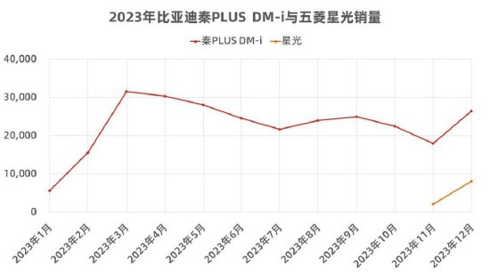 秦 PLUS 和星光身处体量最大的家轿市场。前者在 2023 年初用冠军版 9.98 万元起的价格,奠定了 2023 年全年价格战的基调。而后者在年底,则是用账面上处处高秦 PLUS 一点的产品力,加上 8.88 万元起步的价格,以黑马姿态杀入了家轿市场。2024 年秦 PLUS 荣耀版降至 7.98 万元起之后,星光也是第一个回应,把高配车型从 10.58 万元降到了 9.98 万元。