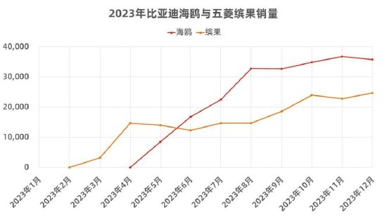 不过,因为两款车型的产品取向、风格有明显的差异,加上精品代步车市场本身也是一个全新开拓的细分市场,所以海鸥与缤果在 2023 年基本保持销量同步上升的节奏,品牌势能更强的海鸥销量高一些。整体来看,海鸥与缤果的竞争,取得了共赢的结果。