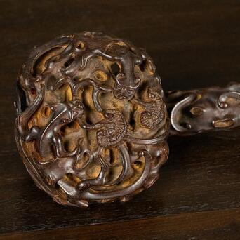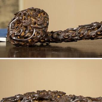 整器造型经典,如意头饱满丰润,柄身婀娜柔婉,柄尾浑圆可爱,从头到尾皆布满以螭龙闹灵芝为主题的雕饰。作者综合运用了浮雕、透雕等多种技法,将螭龙柔曼如卷草的线条和灵芝独特的造型刻画得淋漓尽致,立体感十足,连螭龙神态和灵芝褶皱的细节亦表现得丝丝入扣,可见其工。