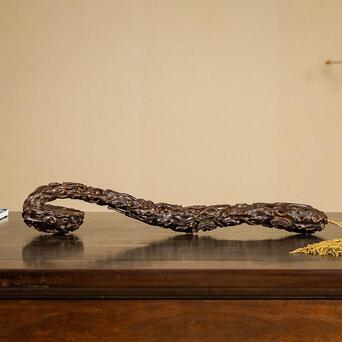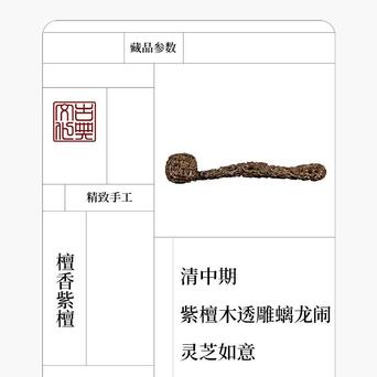 此品如意通身由一整块精选紫檀料打造而成,其皮色沉郁醇厚,质地细腻可人,气质古雅隽永,让人爱不释手。工匠充分利用了紫檀的皮色和质地特性,将整块紫檀料精雕细琢,才打磨出此等精品。