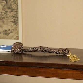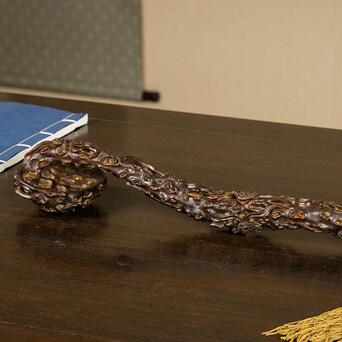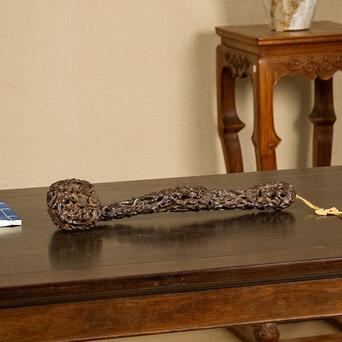 如意,融搔杖与记事笏板为一体,因可如人之意,故名“如意”,后逐渐演化为一种陈设珍玩,是我国传统的吉祥之物,既是文人墨客文房玩赏之物,又是皇家宫廷贵族珍宝之一。